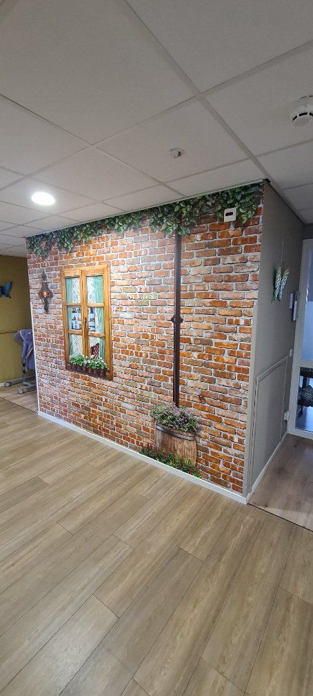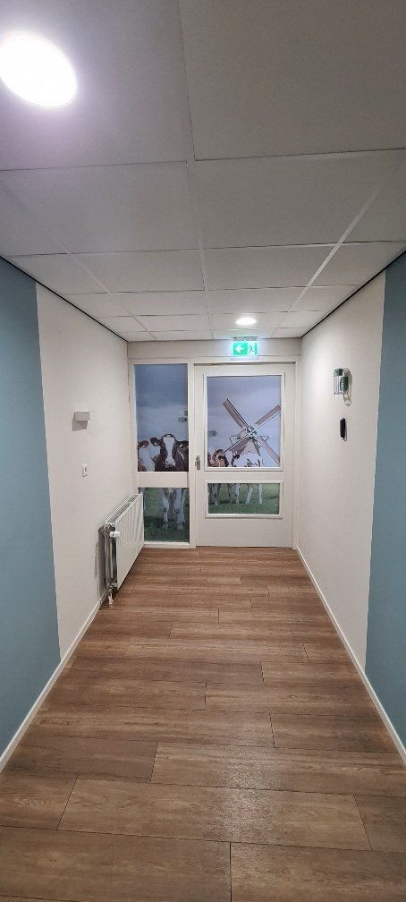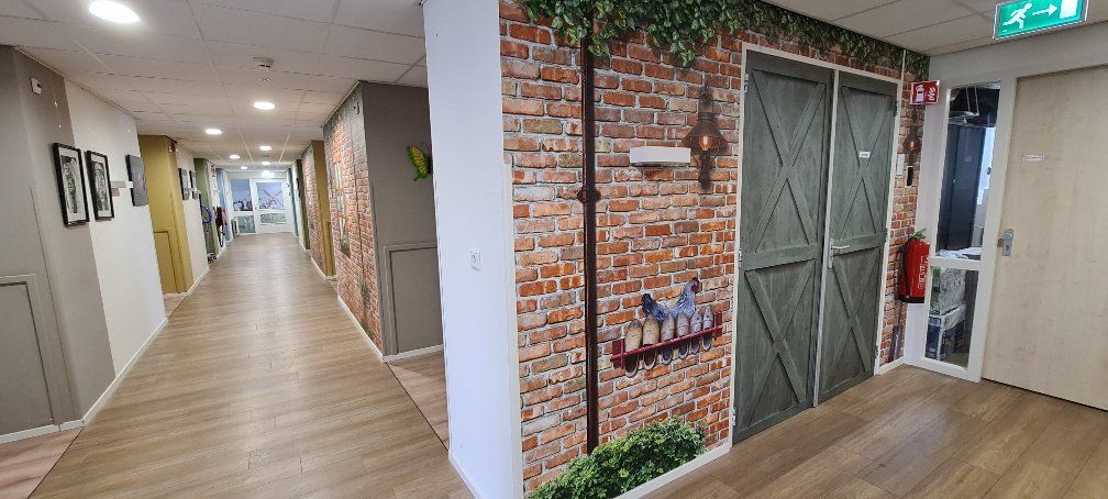 De muren tussen de bewoners hebben wij voorzien van een naadloos behang (afwasbaar) en de meterkast is weggewerkt in hetzelfde thema, zodat alles perfect op elkaar aansluit en de juiste sfeer wordt gecreëerd op de afdeling.